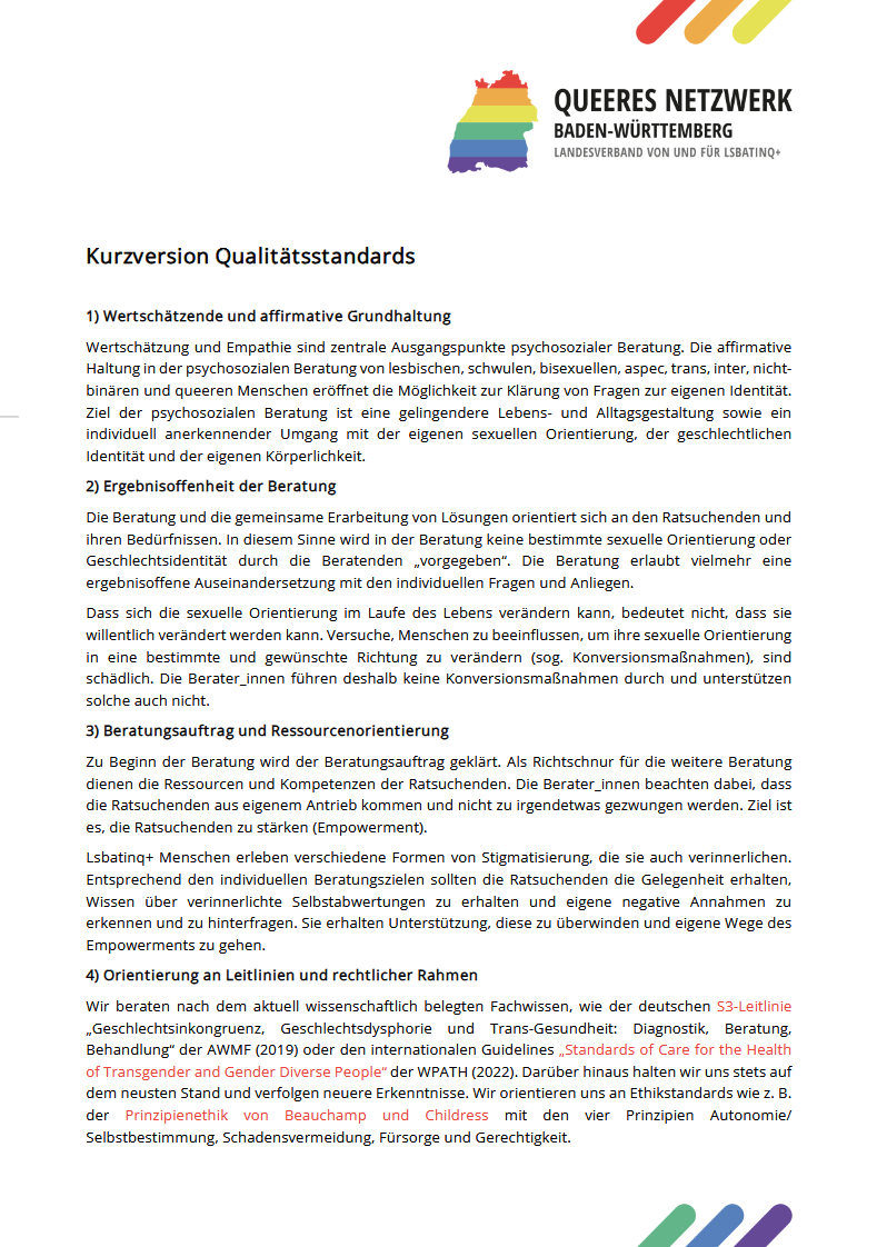 Die Beratungsstandards in Fachsprache wurden am 28.2.2017 veröffentlicht und können hier heruntergeladen werden bzw. als gedruckte Version über den Webshop des Queeren Netzwerks Baden-Württemberg bestellt werden.